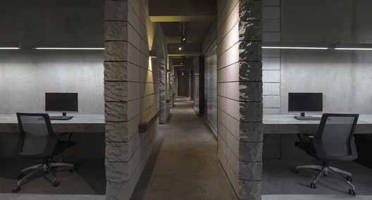 竹模板作为建筑常用材料。室内入口长廊利用竹模板耐磨性、硬度及肌理及来构建,狭长、安静、充满想象空间,给予进入办公空间个体一场精神上的洗礼;轻质水泥砖直接外用,裸露水泥低调粗犷的质感,与原建筑墙面形成色调统一,又不同工艺呈现出的有趣对比;中空阳光板和木质夹板通过工艺细节上精良制作,增强材料使用的新锐感。