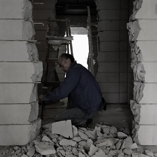空间上,直接保留原建筑单元墙体,以轻质砖分割功能区和过道。通道门洞的形成以人工凿破轻质砖墙的最直接方式呈现,在完整保留了碎砖截面的同时,强化空间的未完成感及可能性。