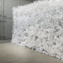 ICD 2018 颗粒材料展亭集合了该学院近十年在建筑颗粒材料领域的研究成果。它是第一个完全由设计颗粒组成的建筑空间,而且这些颗粒以蓬松的触碰状态存在。这一类非接触的颗粒材料展示了他们独特的性能——既能保持固体材料的稳定性能,又能获得液体特有的变形特质。如果这些颗粒分布在设计好的密度中,他们既能形成自支撑式的空间,同时保持完全自由的重组或再利用的可能性。70.000个由回收的塑料材料组成的白色颗粒,如同星空一般。一个大型的可操控的机器人系统将颗粒材料喷成所需的形态。该展亭成功地展示了设计颗粒材料方面的研究成果,展示了解构和重构材料稳定性的可能性,由此也试验了建筑如何快速进行自我重建和重塑然后移动和重利用的可能性。