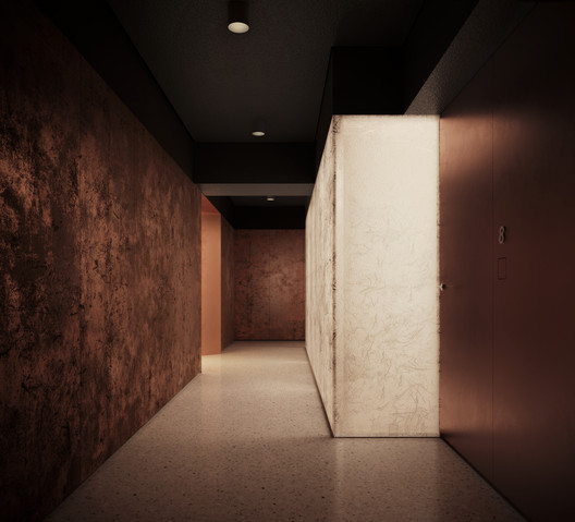 “我们希望保留原有的构造语言, 但也故意与之相矛盾。 例如,入口大厅的混凝土墙体用地板来进行软化,数千个小卵石紧凑在一起,精致得与之对比,一堵乍一看认为是金属的墙壁,仔细一看却是金属灰泥,冲突却也和谐的反映出周围环境。”设计师说。光线通过和纸的过滤氤氲于空间中,柔和、细腻,映射之下,金属墙面更显斑驳、沉静,仿若历史与未来在此对望、缅怀、交流。
