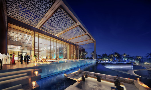 分散的建筑体量,提供了人性化的尺度,带来了多孔性和轻盈感。在酒店部分的裙房内有各种零售和美食店,每个都可以欣赏到迪拜天际线,泻湖和由WET Design设计的华美的特色喷泉。