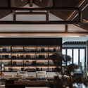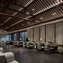 围绕中庭的水院,接待大堂、大堂吧、尚书吧依次分布,一系列无柱举架空间,有别于传统中式木构梁柱体系给空间带来的分隔感,室内设计意图以整体化的语言将这三个空间串联起来,创造舒展轩阔的当代空间感受,并敷以温暖优雅的传统材质与色彩,其间点缀以中式盆景、抽象艺术以及金属细节的灯笼,使人游走于古典与现代之间,而丝毫不觉冲突。