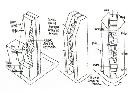 该项目由台中商业银行总部办公空间及奢华酒店组成。项目设计概念以台中商业银行的“中”字为基础。设计避免采用将所有大型功能区堆叠在单一塔楼中的做法,而是打造了两座“分离”的塔楼,并在中间设置垂直空间将其连接并容纳大型设施。