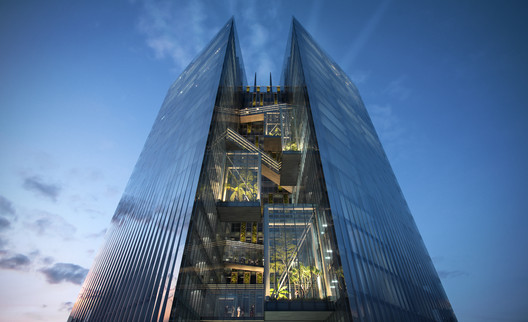 该设计将一系列“漂浮”的透明玻璃盒子置于两座塔楼间的空间中,以容纳如展览区域、空中花园、会议设施、宴会厅及游泳池等多种业态功能。