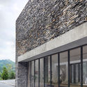游客中心的建筑倚山成形,顺山势布置,阶梯状的屋顶减少体量的压迫感,并呼应两侧农村的梯田风景;建筑自高至低逐渐增加宽度,形成上窄下宽、面向群山敞开的观览平台,沿著平台往下走,视野愈加开阔,来客可以在这里清晰地感受自然的原始力量。从山下仰视时,建筑体量错落有致,像是数个小型建筑的相互叠加,形成类似于传统村寨的形象。建筑外墙由当地的暗色石材砌成,附近民居院落常见相似的毛石矮墙,与原生村落的建筑元素形成呼应。