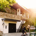 榨汁机位于战争期间由当地居民修建的防空隧道上的一座旧果园中。奥地利政府不知道如何处置这一废弃的隧道,于是我们的客户以极便宜的价格将隧道买下并将其酒窖安置在其中。葡萄酒被直接榨出并通过穿透岩石的管道流入酒窖中的桶内。那段工字钢与6吨重的混凝土配重连接,并由钢筋混凝土框架支撑。