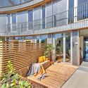 The Corner building通过使用反射原理,建筑的金属表面与附近的建筑和绿化形成呼应,建筑的曲率、开口的外立面和起起伏伏的阳台完美衔接。入口处门上的涂油橡木和阳台下的木板条则起到柔化金属的作用。