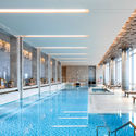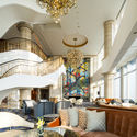 酒店的表皮,采用深色的石材、金属色和灰色的玻璃这三种材料,水平向的金属穿孔板悬挑于玻璃幕墙外,编织出一幅幅如视觉艺术般的生动图案,制造出连续和间断的织物肌理和螺旋状起伏的质感变化。随着视觉角度的变换,这一编织图案也跟着变化,打破常规塔楼的枯燥单调,而统一的细部表现手法,形成层次丰富、色彩鲜明的建筑造型。主塔楼酒店之下低位区域的高端公寓,运用了华尔道夫相同规格的空间尺度和装饰材料。和传统的独栋华尔道夫酒店不同,成都华尔道夫的落位和格局是商业综合体的一部分。延续其经典的装饰性、奢华感、秩序感的典雅风格内核,设计师运用纯现代的手法,结合当地的地域特色,重新演绎了一个具有历史内涵的传统酒店,用精致典雅的现代建筑外观转换到内部经典的奢华感和秩序感空间,实现了内与外、精神与表象、经典与现代的对话。