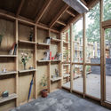 木架子结构很适合在拥挤的院子里面施工,施工的速度比传统的灰砖快,可以很好的使用保温材料也可以很容易的打造储物架。储物架同时也有一定的结构功能,木架结构从室内延续到室外,整体呈现出连续统一的视觉效果。