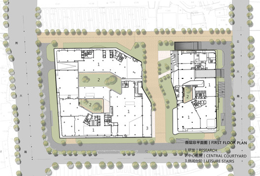 裙房的设计首先遵循城市设计的走势,辅以相应的景观设计形成南北向视线通廊,既让视线渗透直达北侧公园,保留住城市景观的通达性,同时也保证了建筑整体的连续性和屋顶活动场的可达性。建筑形态上,其四个角点态势较高,而其他区域按功能需求和流线形式从一层到三层在不同的位置各有高低起伏变化,在稳定的形态中营造一种连续的动感。形成“海洋公园”式的规划布局,建筑造型也呼应和承载着“鲸鱼”个推的企业文化。
