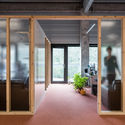 二楼是工作区和领导办公室,是由许多封闭的办公室盒子、半开放的会议室盒子和开放的公共空间组成的。它们按功能单元划分,通过主题放松区相互分隔。办公室的盒子通过一个宽敞的门廊与外部相连。在夏季,员工们可以将工作空间扩展到室外。