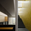 建筑体量经由給定的场地条件进行精准的划分切割与整合。在建筑的主入口门厅(最靠近校园入口),空间被切割为一个相较独立的建筑体量,入口藏于体量下方,藏而不露。