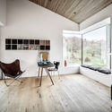通过建筑立面上的大开窗可以欣赏到湖泊,森林和天空的美景。 这些非凡的景观为住客提供了独特的空间体验以及与周围自然环境的紧密联系。立面上的 两个大型镀锌盒子打破了传统的房屋形式,同时使设计更具现代感。 这些盒子为房子提供了两个大凸窗,而室内部分则设计成一个舒适的飘窗,通过这里可以欣赏到森林的景色。