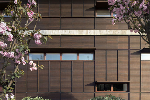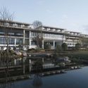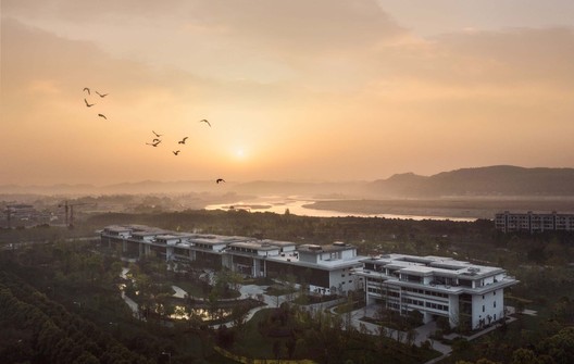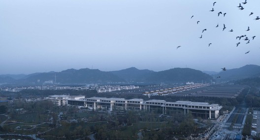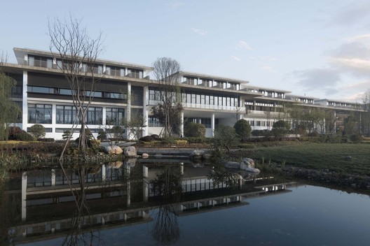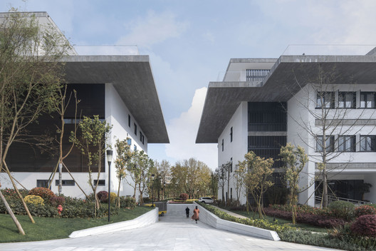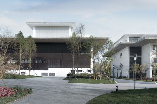 文化中心综合体被视作连接工业园区与自然景观的纽带,其建筑空间由一系列带内院的馆所以线性排列的方式组成,而形式语言则由深檐和木板墙等低调的本土化词汇所构建。