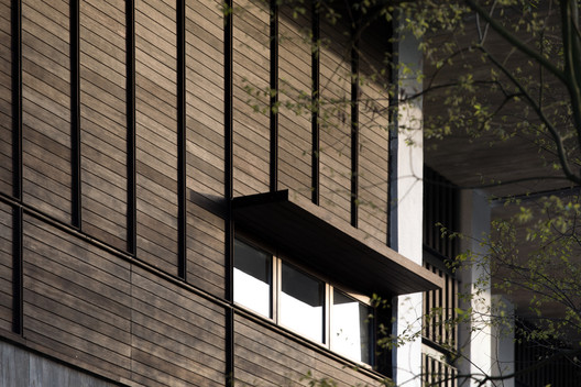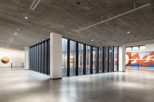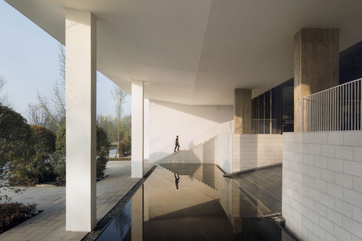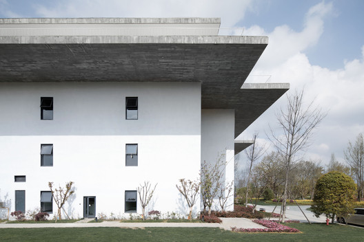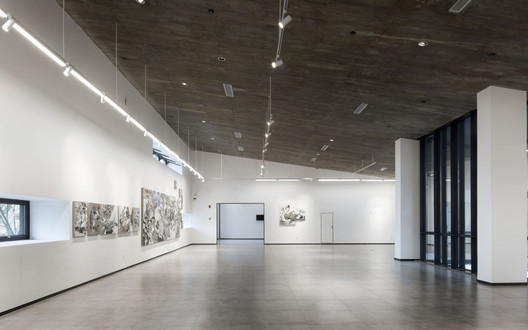 馆所的断面中,无梁混凝土楼板从中部朝两侧悬挑而出,好拟一把张开的伞。这把“伞”从檐口到中心处逐渐由薄变厚,并在最厚的区域承担藏匿暖通管道的需要。