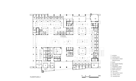 在立面处理上强调大面积玻璃幕墙与百叶格栅的虚实对比,以及横向白色大理石与纵向百叶的横纵对比。没有多余的装饰物,反而给予建筑一种纯净优雅的气质。