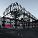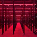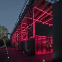 紧连着休闲看台的空间由一个闪着红色灯光的LED灯条矩阵构成,自远处便相当引人注目,标识出一个充满视觉冲击力的户外舞台。户外舞台占地436平米,可容纳340名观众,是一个适合热玻璃表演以及各种现场表演的空间,围绕着阶梯座位的灯光装置完美地表达了舞台上热力四射、激情澎湃、流光溢彩的氛围。
