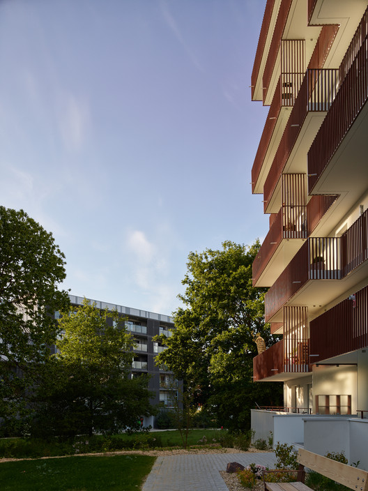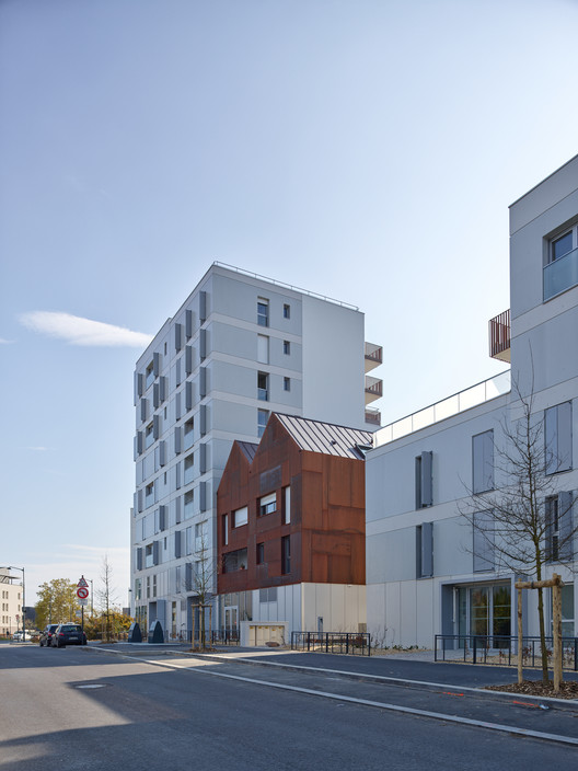 值得注意的耐候钢的使用,在雷恩很不常见,点明了该项目的关键元素。它已被用于阳台扶手和房屋内部。这种特殊材料在阳台上构成的线条与这种渗透性的体块设计相呼应。这可能是一种新型共产村落吗? 如果我们把容纳公共洗衣设施的休闲房间纳入考量,这个项目以自己的方式重新阐释和转译了一个乌托邦构想。