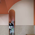 后厅用“大拱形”将各“商业”融合在同一“天地”,不同商业既要彼此有界限也要有属于自己的商业属性。开敞的空间,设计通过不同材质对地面及墙面进行“分隔”。空间尽头地面及墙面运用手工青砖铺设区分,凸显火烧云的独有的云南质朴特色,沉静内敛。木地板铺设梯台及墙面是前厅与后厅之间的界限,自然惬意。空间的粉色、灰色和木色交织在一起,却又是另一种视觉语汇。