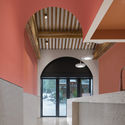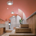 最具西方建筑代表的”圆拱”与前厅的中式人字顶形成文化的对撞,粉色与古朴的木色之间的融合,白色与粉色的相互衬托,低调、纯粹、亲和,让人放松。一切都那么自然,毫无违和感。