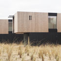 它的外观和游客中心相似,但并没有混凝土地下室,而是有一个考顿钢制的体块在屋顶上。在这个封闭的体块中是管理者的屋子。这个体块让人觉得它已经在这儿很久了,像是附近的海对材料产生了腐蚀作用。管理者的屋子只对着海的那面开放,坐拥无敌景观。从这一边管理者可以进入屋顶露台,可以绕体块一圈,观赏到公园、沙丘、F1赛道。在屋子中间优格天井,能把光线带到整个屋子里。社交性的项目都位于底层的玻璃体块中,那儿可以开放,使室内外紧密相连。在公园内部,游客会发现5中类型的小屋。每一种都用了特别的方式和主题来设计。
