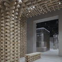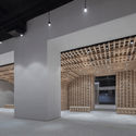 此区域为整体空间的开始,扶梯下到现场后第一个呈现的视觉空间。它是由一组木结构装置组成的展示空间,定义为传统文化馆,用来展示世界各地的传统文化物品。我们用最能代表中国建筑文化的“木结构”来展示世界的传统文化,是对此空间最好的诠释。