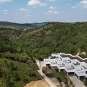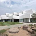 建筑设计的概念来自于对场地的阅读。基地位于园区东西向主路和一条向北次路的交叉口,呈不规则的三角形,北窄南宽,东北和西北方向有丘陵,西南向较开阔,具有较好的对景。业主在设计团队介入之前已经将场地进行了平整和拓宽,也开挖了基地东北侧的丘陵,对原有环境有一定的改变。面对裸露的,高达15米的边坡,设计团队提出用建筑进行生态环境修补的想法:将建筑退让至场地边界,与开挖的山体衔接。建筑从场地中央位置挪开,既创造了开阔的户外空间,又使建筑成为自然山体的延伸,由此得出建筑面向西南,背向东北,依山面水而建的基本格局。