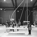 一道直墙将整个展厅划分为两个独立区域。大量观众共同参与的活动在墙后侧展开,正对着展厅的大玻璃窗。