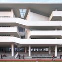 基于场地局促的条件,教学楼与宿舍楼均底层架空以释放出更多的地面空间并使之连续。抬升至二层的教学楼中心庭院通过大台阶与操场相联系,既是休憩交流之所,又成为面向操场的看台。