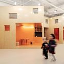 合作舍将孩子的活动空间设计成了一条公共街道,连接被放置在场地尽端的功能房间和大空间。一些体量和形状各异的小木屋沿着街道布置,形成连续的边界,环绕整个空间,类似一个小小的村落。为了实现保护和连接的平衡,木屋被设计成半开放的,由墙体围合出角落,门洞和墙上的小窗让孩子的身体和视线可以在木屋之间自由的穿行。