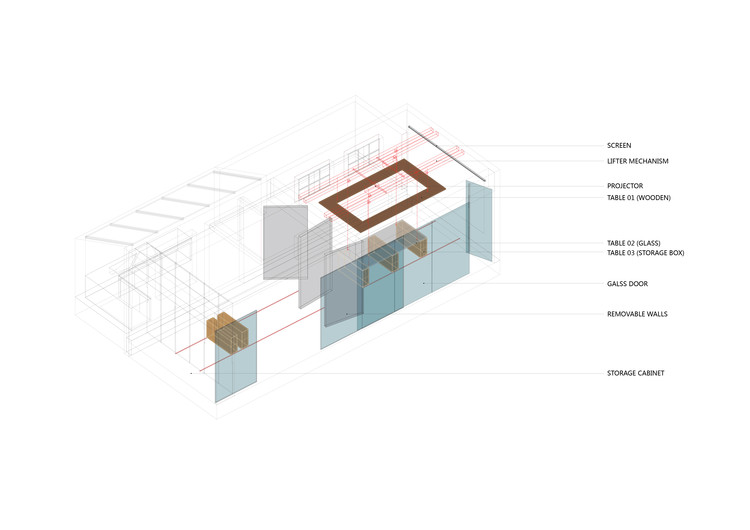 将两侧的矩环形桌面通过悬索调整到合适高度后,该空间可以为会议、评图和讲座等活动提供适宜的空间。对于需要满足更多人参加的大型活动,则可以将会议室和多功能室之间的三面旋转隔断门打开,将两个空间联通起来进行一体化使用。